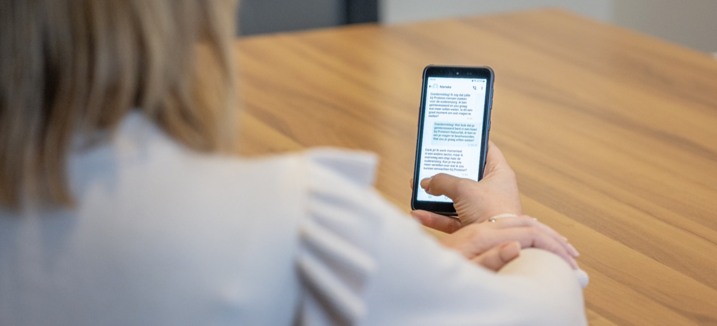 Ben jij geïnteresseerd in een baan bij Proteion of wil je meer weten over werken in de ouderenzorg? Dan willen wij graag met jou kennismaken. Elke dinsdag van 15.00 tot 16.30 uur zijn we beschikbaar om met jou te whatsappen of bellen. Voor iedereen die kennis wil maken met Proteion en de ouderenzorg en benieuwd is naar wat werken bij Proteion zo bijzonder maakt. Er zijn tal van mogelijkheden. Ook als je bijvoorbeeld vanuit een andere baan de overstap naar de ouderenzorg wilt maken. Wij vertellen je er graag meer over en beantwoorden al je vragen. Bovenal zijn wij benieuwd naar jouw verhaal.